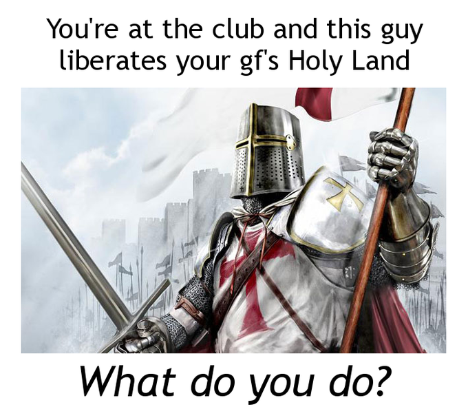 Deus vult crusader memes. All posts must be crusade related. Deus vult in crusader kings as such deus vult became a meme within the crusader kings userbase sometimes in reference to remove kebab internet slang for turkish people loosely harking back. Deus vult crusader memes. Crusades memes loosely refer to the wars fought between christians and muslims over various holy sites in the middle east between 1096 and 1291. These memes go in a variety of directions but most of them feature crusade style helmets or the phrase deus vult. We would like to show you a description here but the site won t allow us. Many crusades related memes reference the video game crusader kings ii.